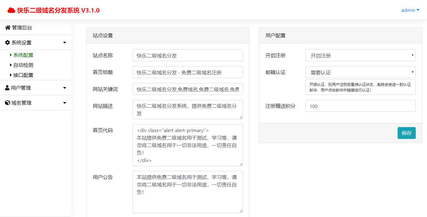 快乐二级域名分发网站源码是一套非常不错的程序,安全上是无毒无后门,使用上也是非常简单方便,快乐二级域名分发网站源码源码如果有新版了我们也会持续分享给大家。