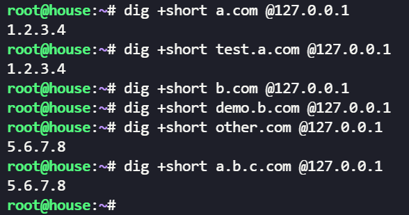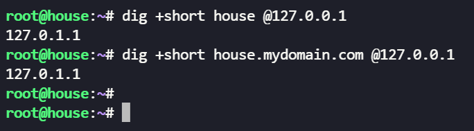 --expand-hosts 参数可以支持对 hosts 文件中的主机名,添加域名后缀的解析,使用 --domain=<domain> 参数指定后缀,比如上例中,如果添加参数 --expand-hosts --domain=mydomain.com ,那么解析 house 或者 house.mydomain.com 都会返回 hosts 文件中的配置。