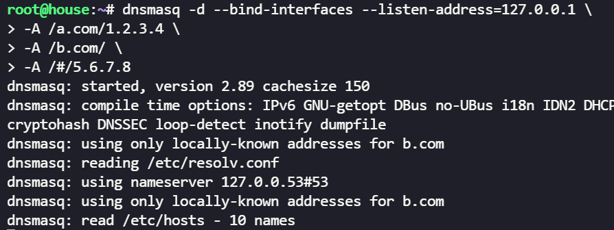 dnsmasq --bind-interfaces --listen-address=127.0.0.1 -A /a.com/1.1.1.1 --no-resolv --server=8.8.8.8