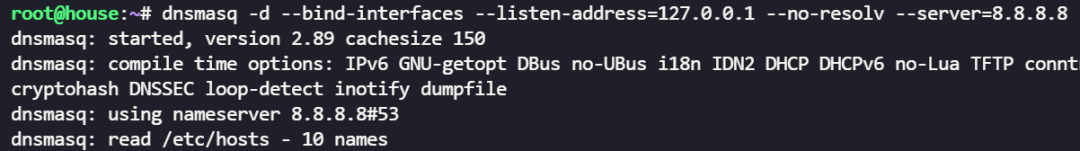 dnsmasq -d --bind-interfaces --listen-address=127.0.0.1 --no-resolv --server=8.8.8.8