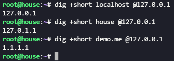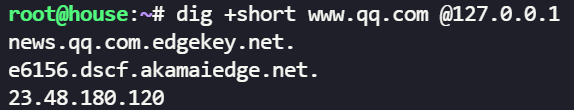 使用 dig 命令指定刚启动的服务做测试: