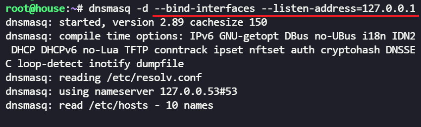 dnsmasq -d --bind-interfaces --listen-address=127.0.0.1
