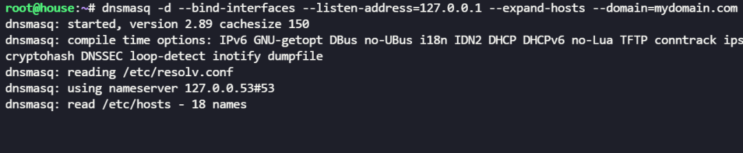 dnsmasq -d --bind-interfaces --listen-address=127.0.0.1 --expand-hosts --domain=mydomain.com