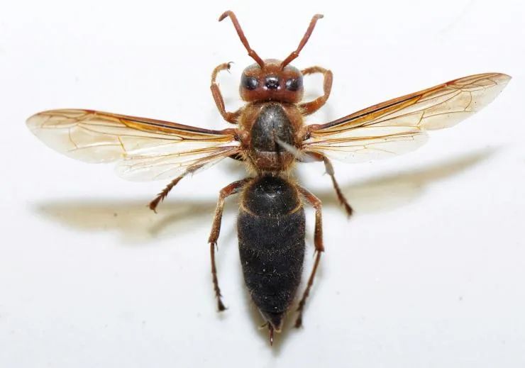 黑绒胡蜂,别称:黑腹虎头蜂、黑绒虎头蜂,体型较大,胸部背板红黑色且腹部为深黑色,身上绒毛较多。