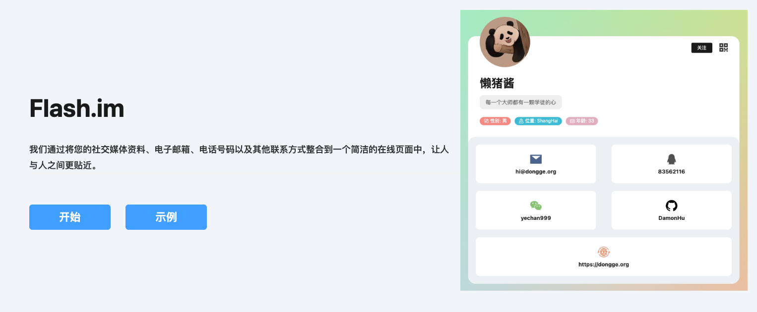 通过 Flash.im可以聚合展示社交媒体资料、电子邮箱、电话号码以及其他联系方式。将这些整合到一个简洁的在线页面中,生成一个个人主页的链接。在开放的互联网中可以更方便的联系到你。会根据不同的链接类型跳转不同的类型