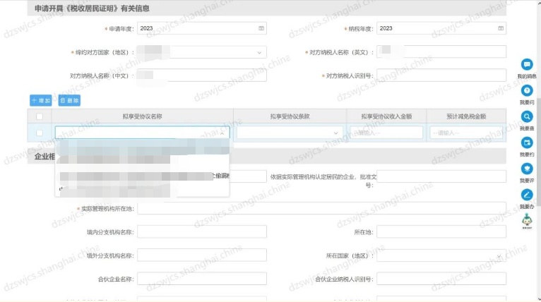 3.选择申请年度、纳税年度、缔约对方国家(地区)、对方纳税人英文名称、缔约对方纳税人识别号;